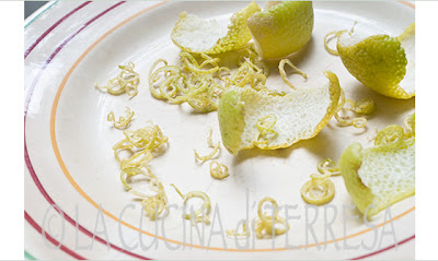 — Make the lemon curlicues (photo below or watch my video): Wash the lemon with a vegetable scrubber then dry. Using a vegetable peeler, remove the zest. Cut off any pith by laying a very sharp paring knife flat against the pith and, pressing down, zigzagging back and forth to remove the pith from the zest. Slice lengthwise into very - very - thin strips. Dry in an oven preheated to 110 ˚C (225 ˚ F) for 5 – 10 minutes, or until the zests begins to curl, shaking from time to time. Watch them carefully, as you don’t want the edges to brown. Remove and set aside. You can also make the lemon strips the night before and just leave out in a bowl until the morning. Cover until ready to use later in the day. Can be kept in a glass jar for 2 days.