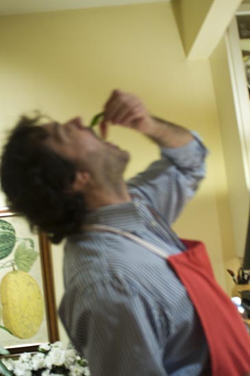 Giving cooking classes in this weather demands a change of venue... Much less oven activity to be sure and lots of fresh salads and deserts. But since my clients often ask to learn my Roasted Radish recipe, I nonetheless have to light up the oven for a short stint... 2 - 3 minutes of roasting and the leaves are crystallized to a bright green transparency, the radishes still crunchy. Inevitably I always find myself with fresh radishes galore left over and, inspired by the heat, I came up with this Radish Smoothie... quite refreshing and simple as can be. Recipes below..