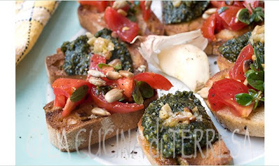 Note : You might wish to garnish each bruschetta with a small spoonful of roasted hazelnut olive oil. Simply roast a small handful of hazelnuts until their skins start to crack. Wrap them in a towel and rub them vigorously to remove what skins will come off. Rapidly chop them somewhat fine and place them in a small bowl. Add a pinch or two of fresh lemon zest and enough quality extra virgin olive oil to just cover. Set the bowl near a stove pilot for an hour or so (or make the flavored oil the night before and leave out in a warm place over night). Just before using add a pinch of sea salt. Put a bit in a teaspoon and top the watercress pesto with the oil, pressing down to make a slight well for the flavored oil to sit in. Garnish with a a slight pinch of chopped black olives twist of freshly ground pepper.
