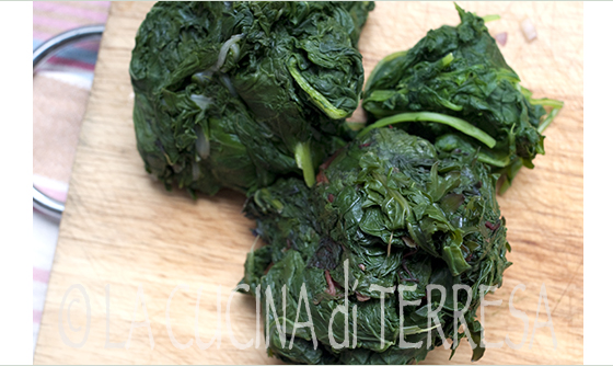 — Wash the greens. Transfer to a skillet without spinning dry (in 3 - 4 batches) and cook covered until wilted, 3 – 5 minutes. Transfer each batch to a strainer. Add a few splashes of water to the skillet if needed. When cool, squeeze out any excess water then finely chop: flatten the mass of leaves on a cutting board, cut crosswise every ½ inch and likewise lengthwise.