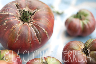 — Bring a large covered pan of water to a boil and remove from the heat. Score your tomatoes, 400 - 500 gr / 1 lb, and blanch for 45 seconds in the water. Peel then seed them over a bowl to catch any juice. Cut into bite-sized dice, place in a strainer and drain all juice over the same bowl. Toss with a bit of sea salt. (Don't throw the skins, seeds and juice away. Pass through a food mill, put in the fridge and use for another dish the following day.)