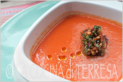 Thus I undertook to create a simple red gazpacho with a darkly deep tang. First thing I did was set aside the cucumber, replacing it with young fresh radishes — bulb, root, even a bit of the stem. Roasted the peppers The rest is down below. I came up with this "basil chutney" served on bruschetta that goes quite wonderfully with the gazpacho.