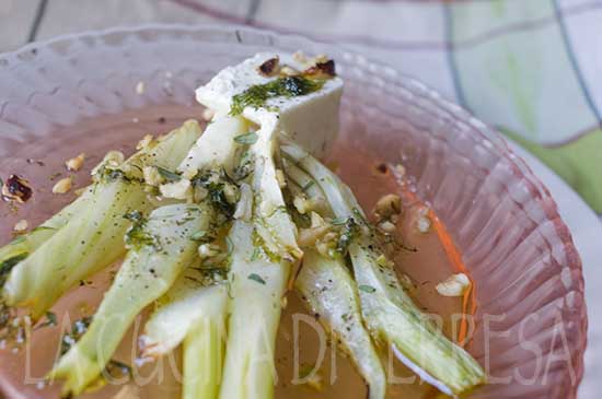 — Turn on the broiler and, when hot, place the dish at a distance of about 5 inches from the coils or gas and roast until golden brown (about 5 minutes on each side). The fennel should be al dente.